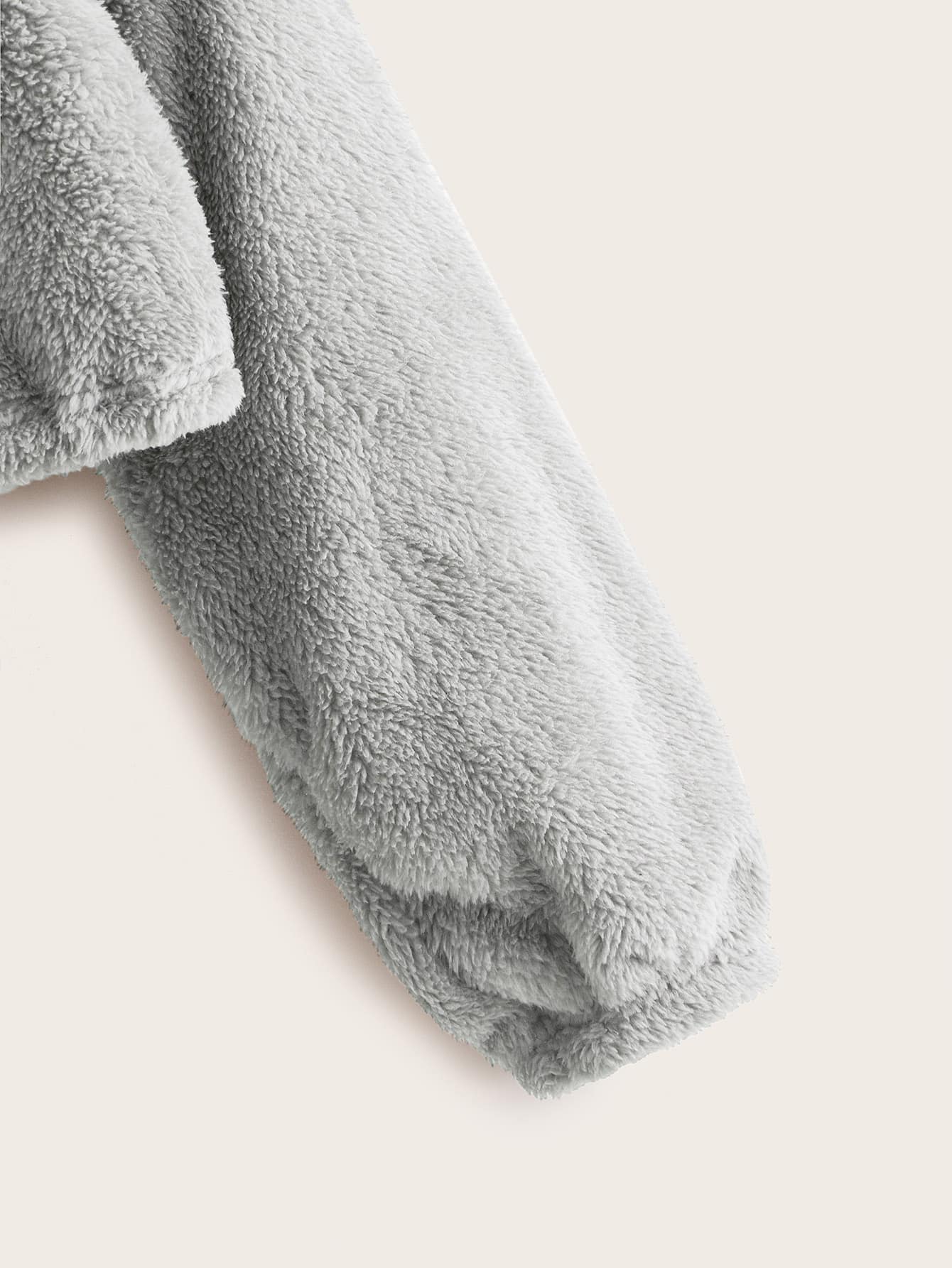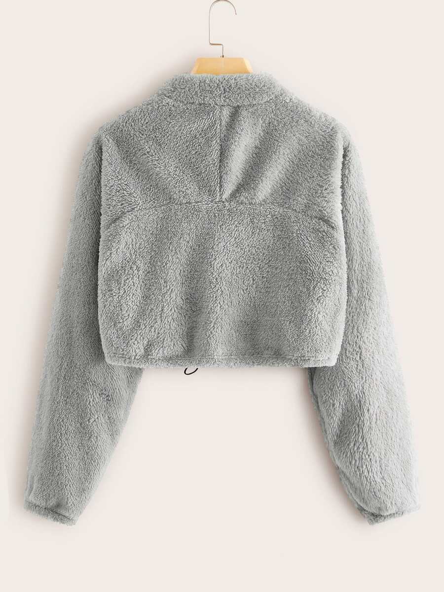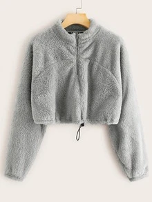Zip Half Placket Drawstring Hem Teddy Pullover
