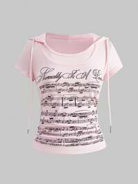 J-Fashion Y2K Retro Millennium Babe Music Note Print Hooded 2 In 1 Short Sleeve Top