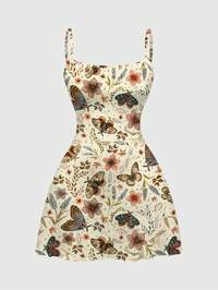 Fairycore Romantic Floral, Butterfly, Sun & Moon, Mushroom Print Camisole Waist Cinched Sexy Slip Dress For Women, Nature Style, Autumn/Winter