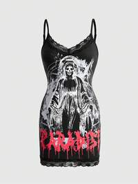 Gothic Skeleton Print Contrast Lace Mini Bodycon Slip Dress