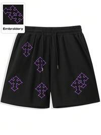 Goth Men's Casual Fashionable Street Cross Embroidery Drawstring Waist Loose Shorts, Summer