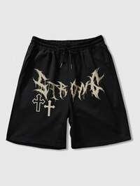 Goth Men's Letter & Cross Print Drawstring Waist Casual Shorts