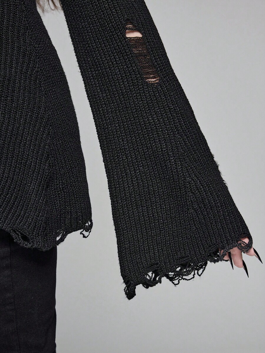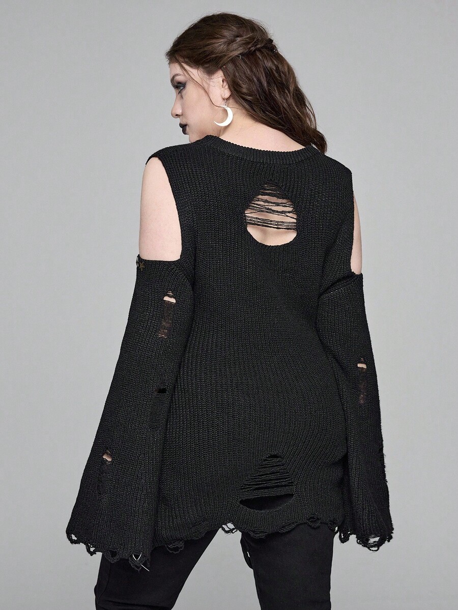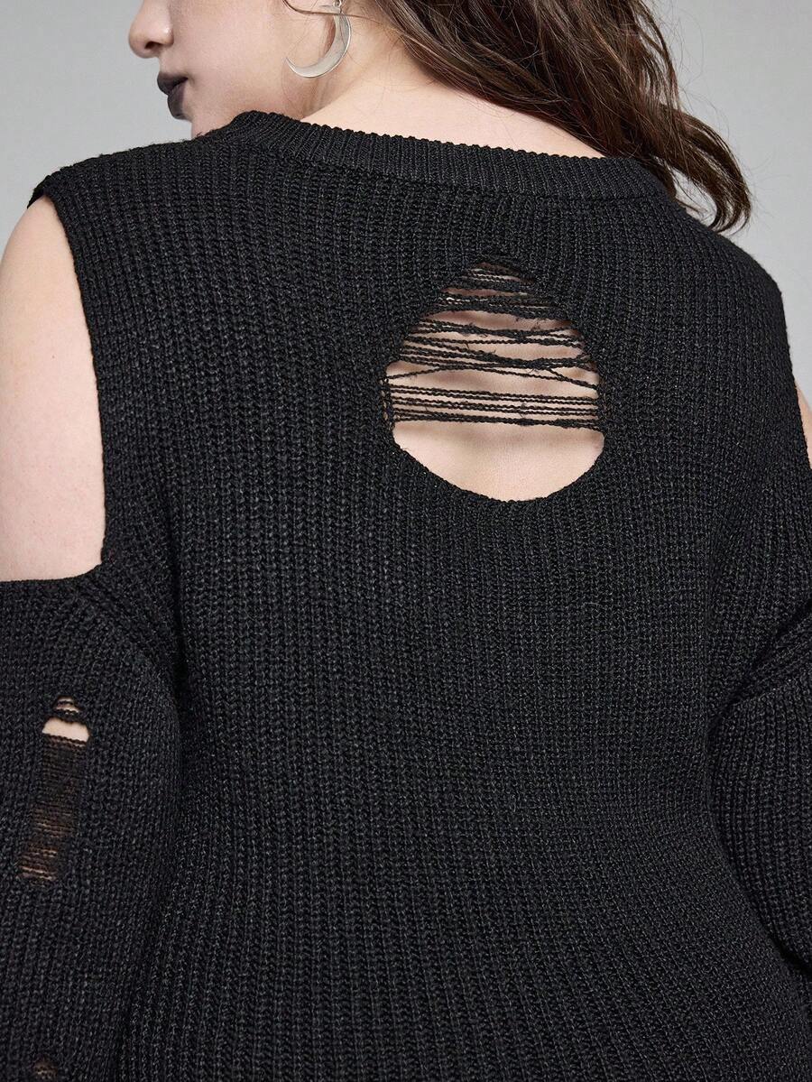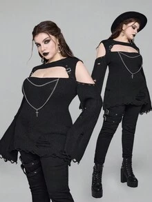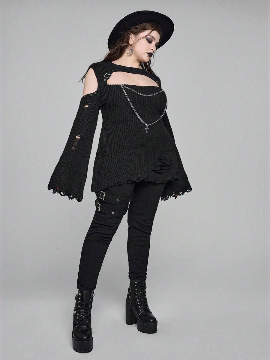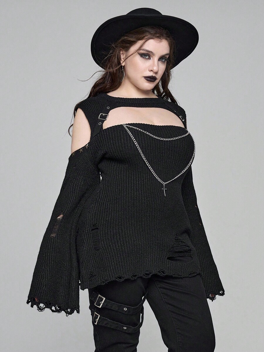 Plus Size Gothic Cross Double Chain Ripped Black Sweater, Autumn/Winter Distressed Fashion Retro Gothic Style Plus Size Women Pullover Sweater, Plus Size Women Sweater Top, Party Evening Street Punk Gothic Style Plus Size Women Black Pullover Sweater