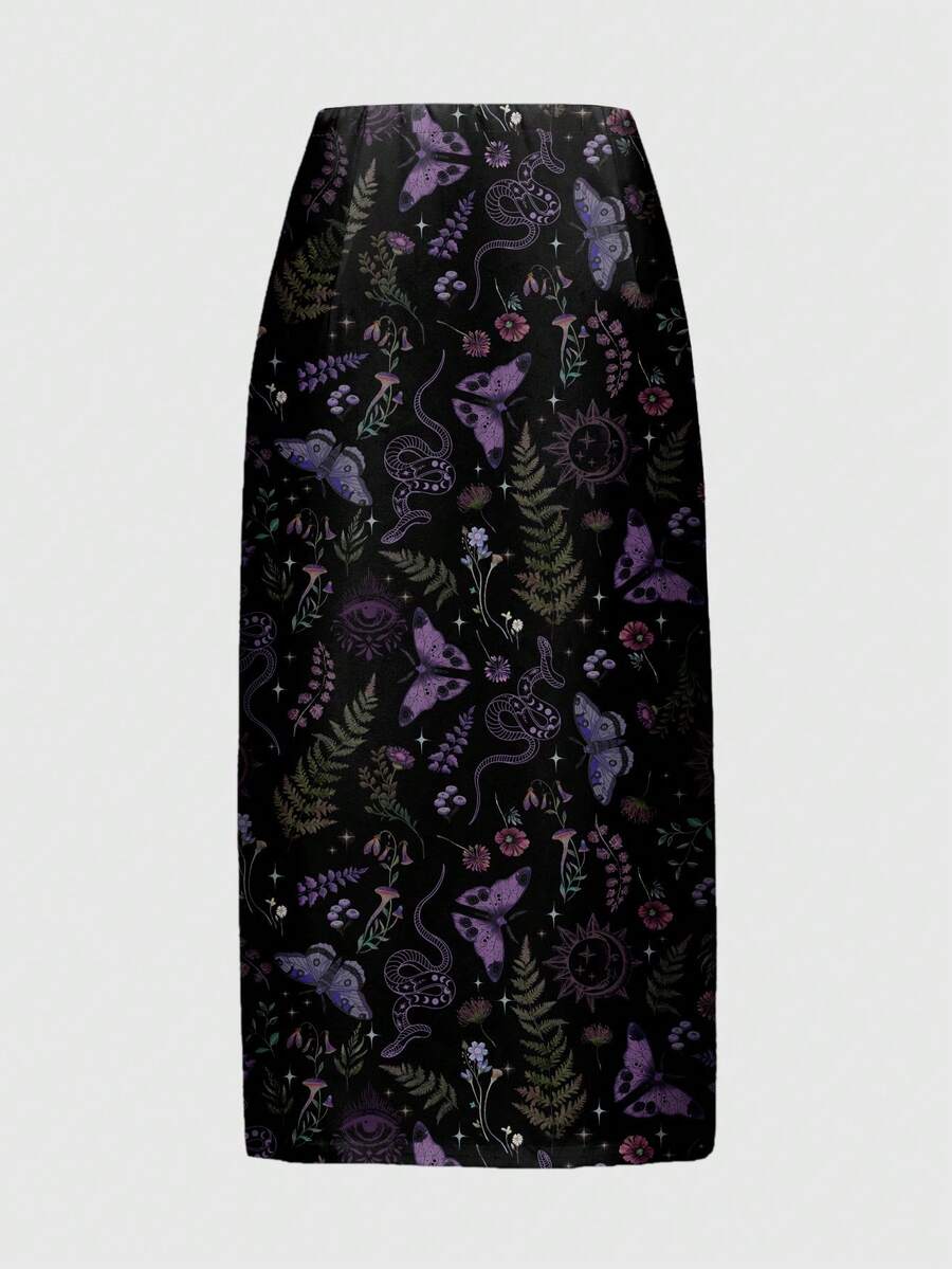 Goth Purple & Black Mysterious Dark Floral, Sun, Moon, Star, Butterfly & Snake Print High Slit Skirt For Women