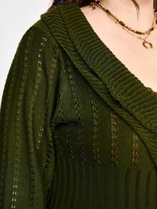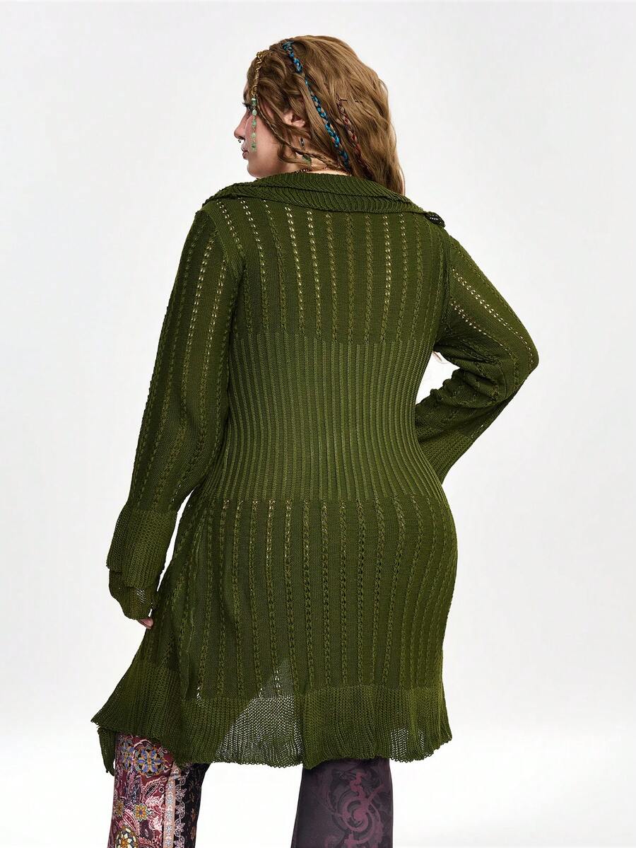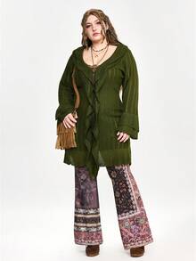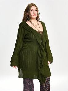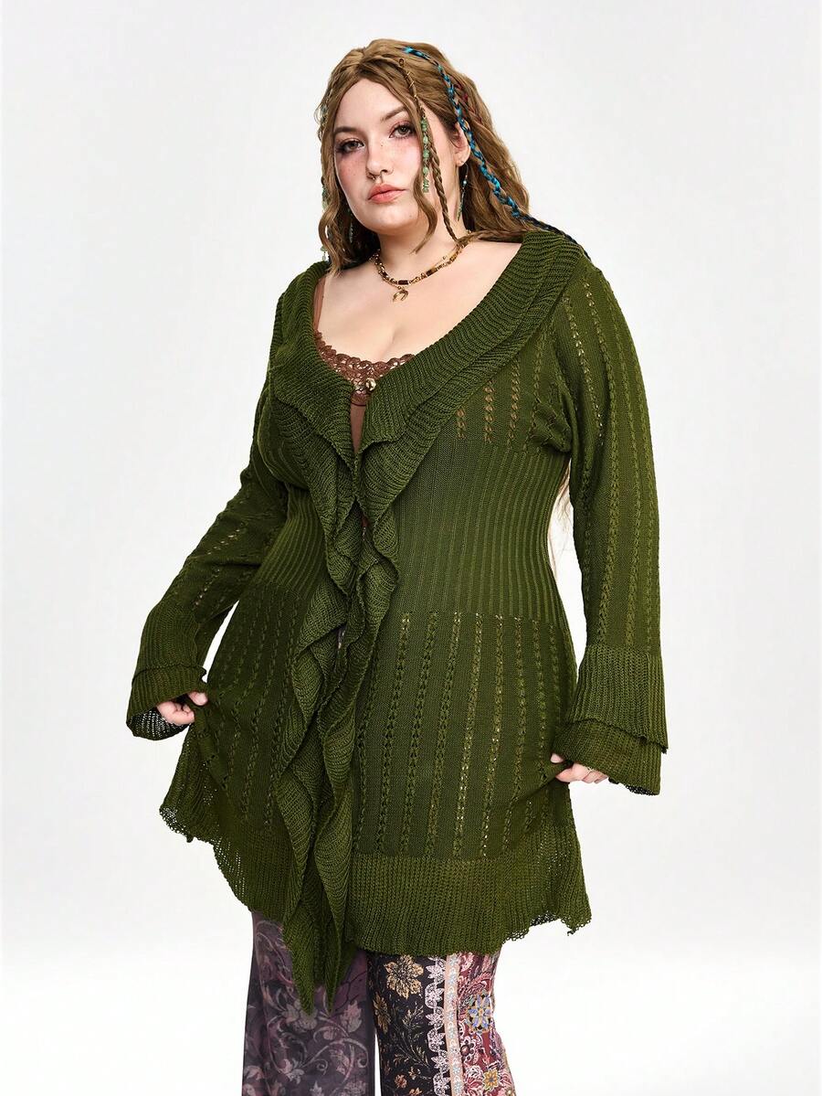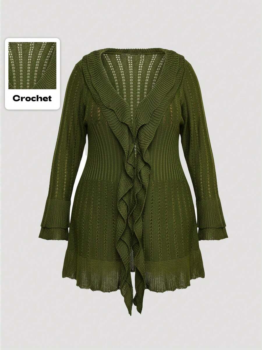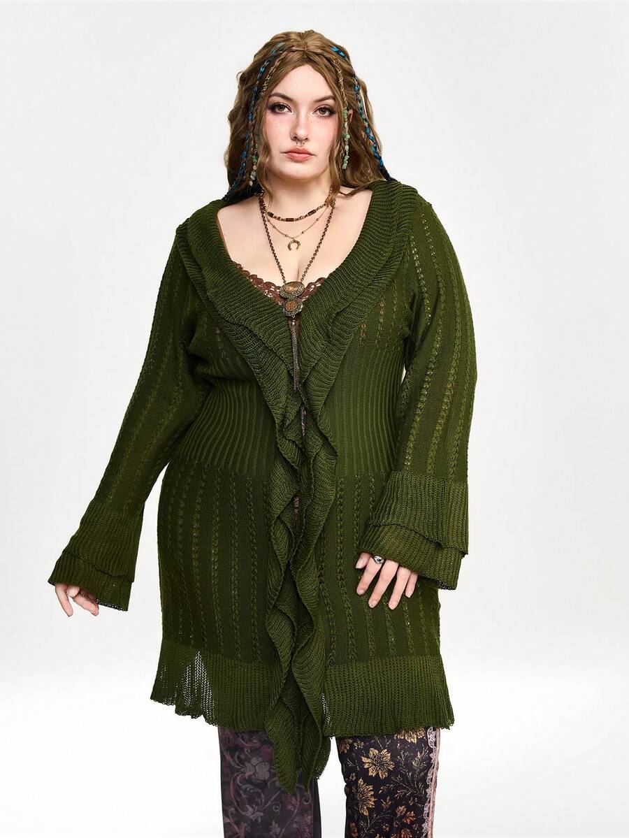 Fairycore Plus Size Vintage Green Olive Green Double-Layer Ruffle Flare Sleeve Knit Cardigan, Autumn/Winter Plus Size Women Sweater Cardigan Jacket