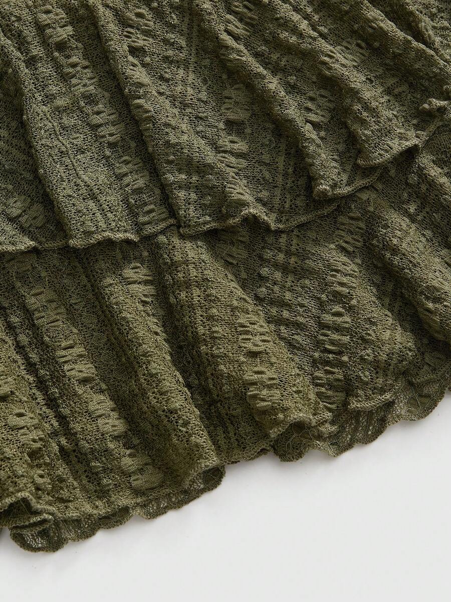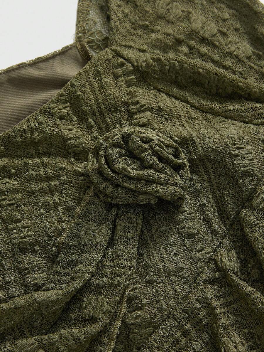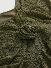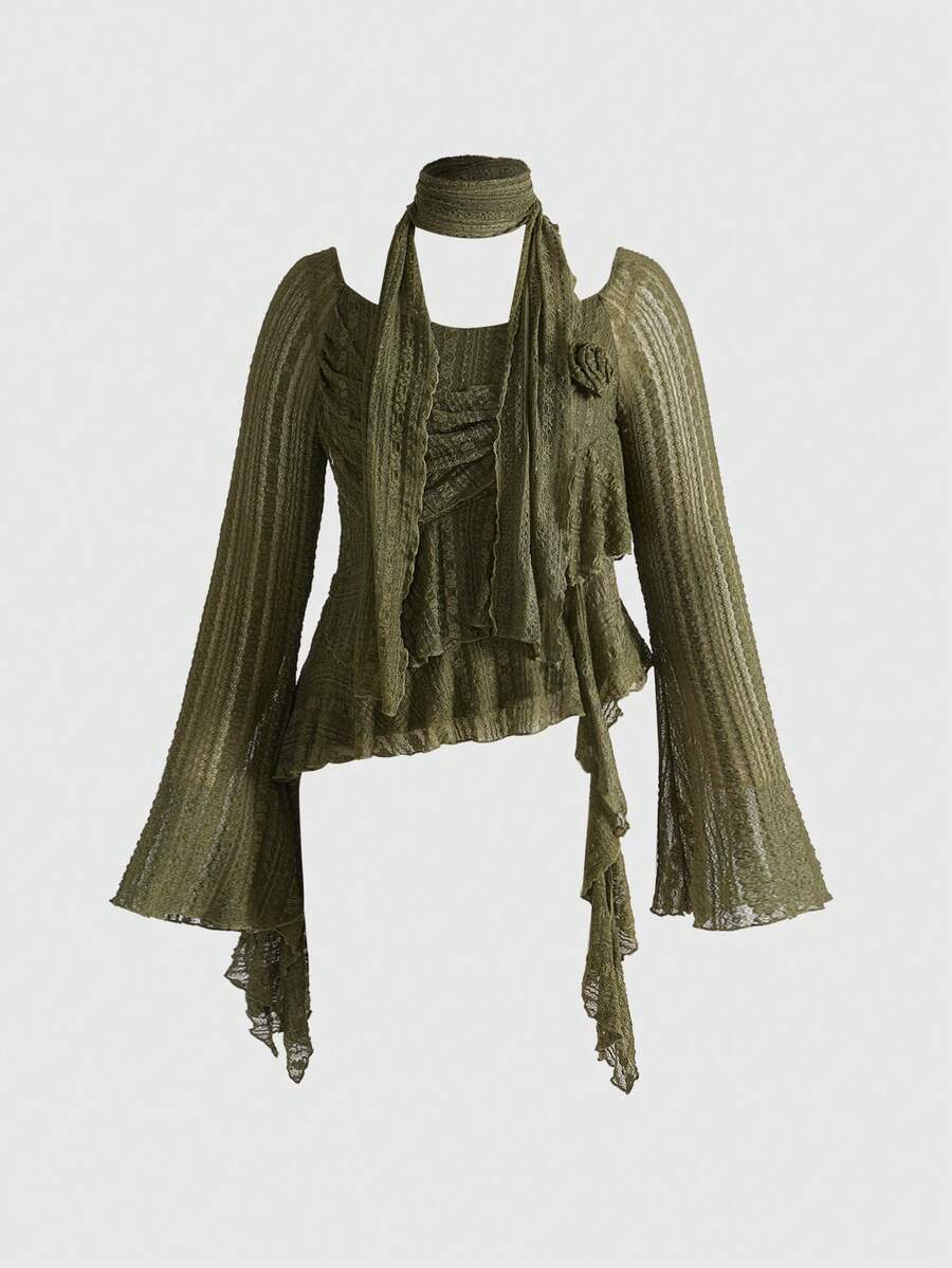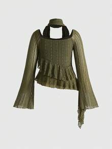 Plus Size Women Asymmetrical Asymmetric Design Textured Knit Top, Elegant Vintage Fairycore Green Pullover Sweater With Ribbon Tie Neck, Suitable For Autumn/Winter