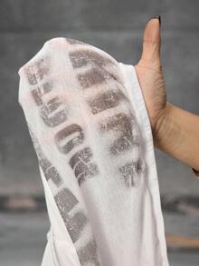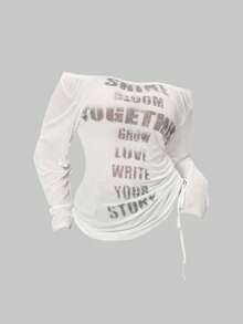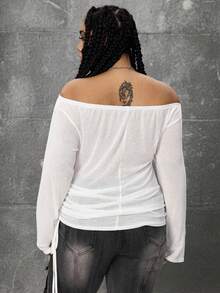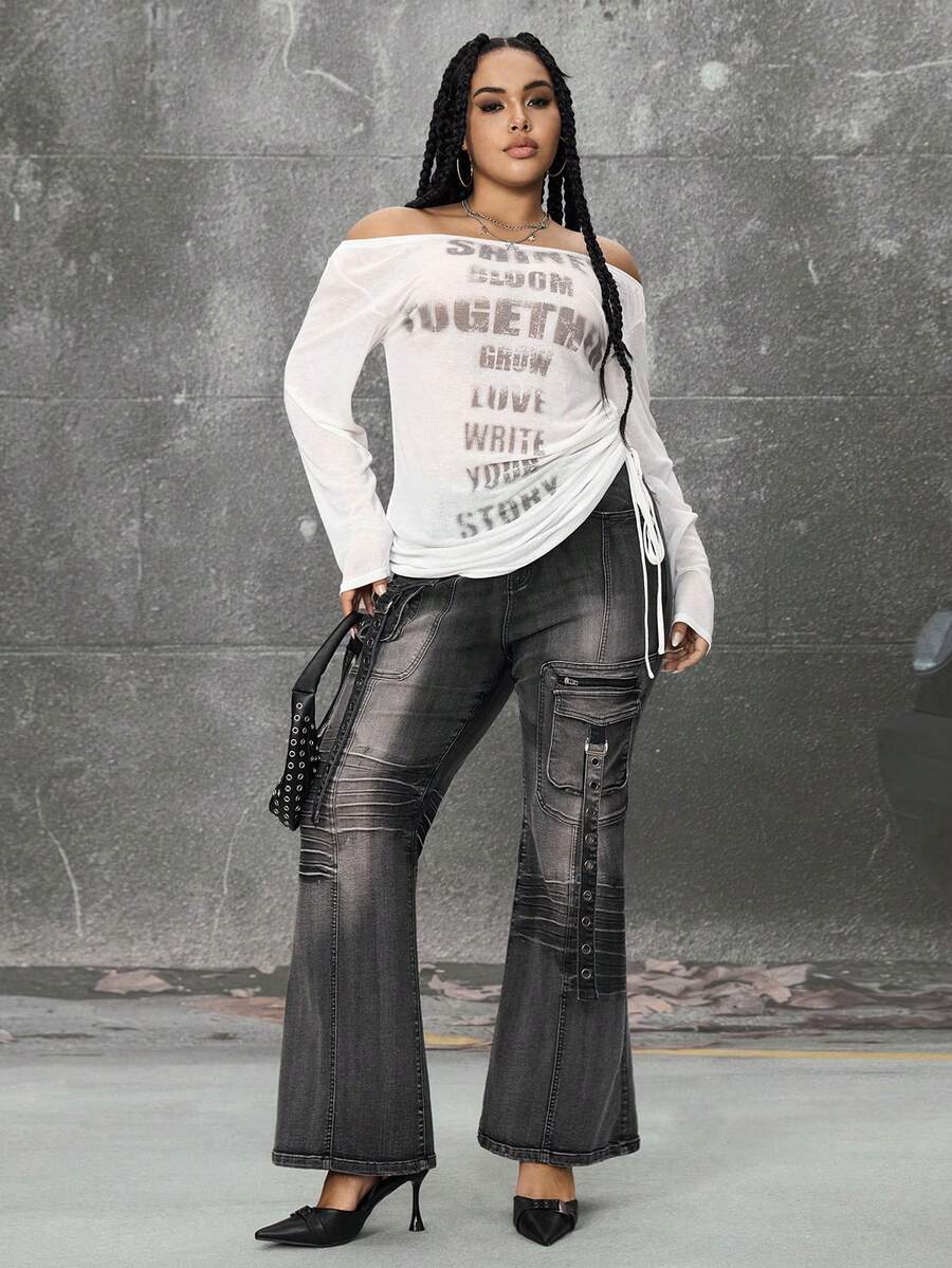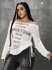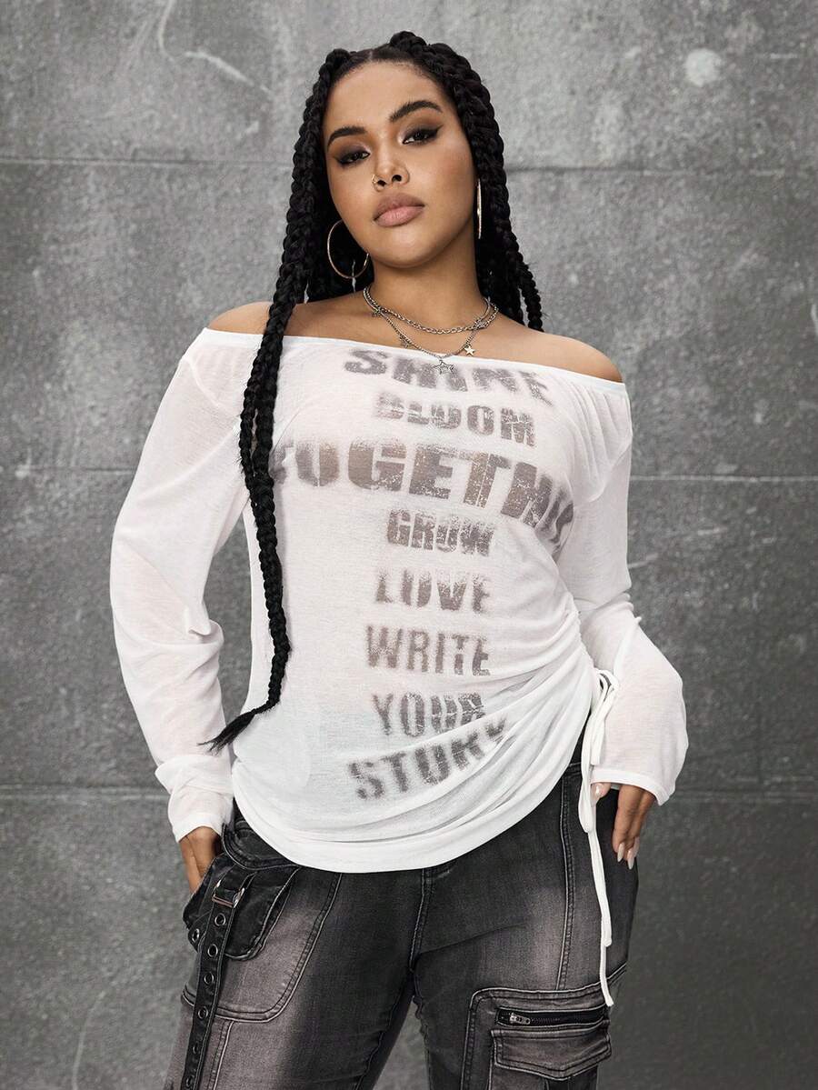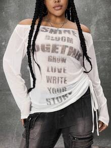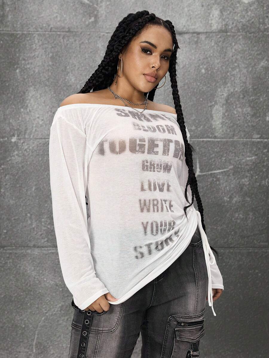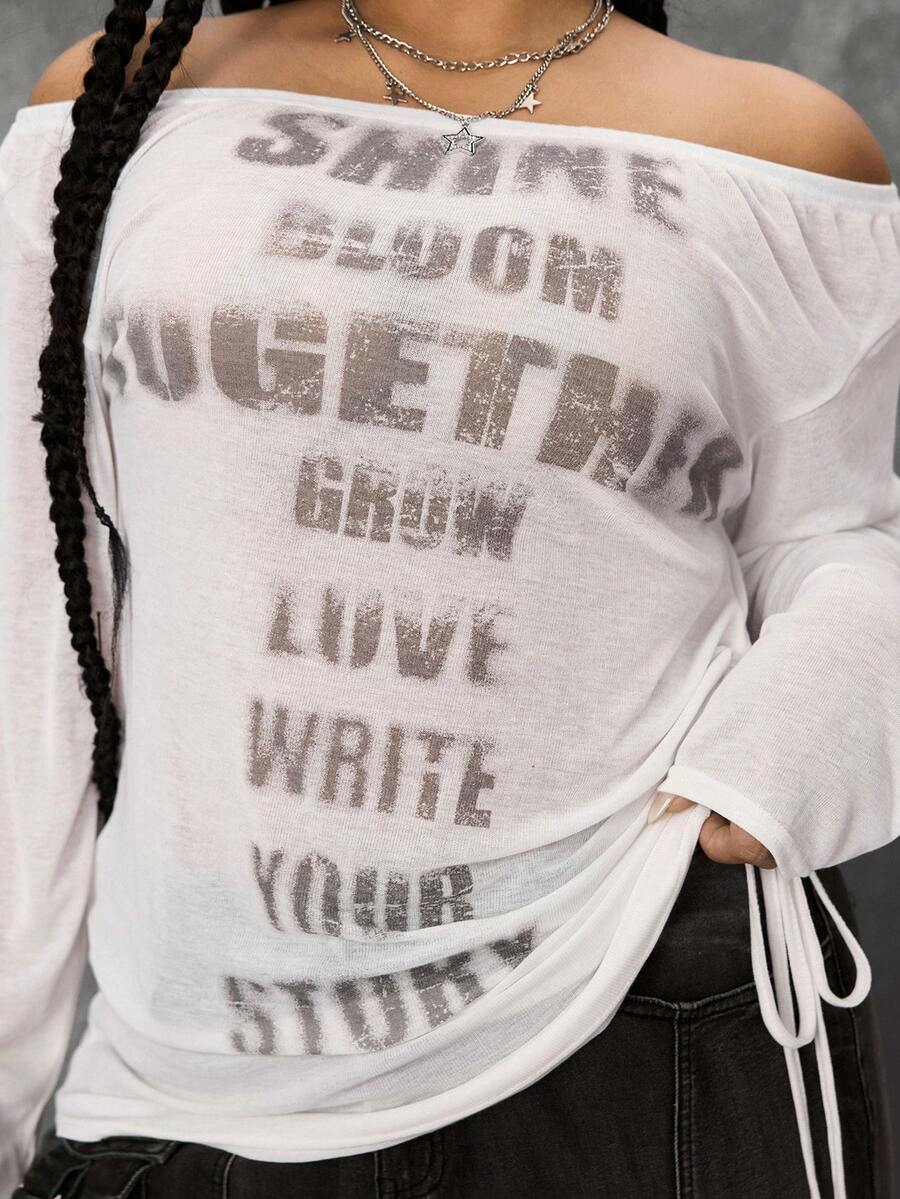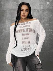 Grunge Punk Romantic Punk Cross & Letter Print Off-Shoulder Plus Size Women Long Sleeve T-Shirt Top