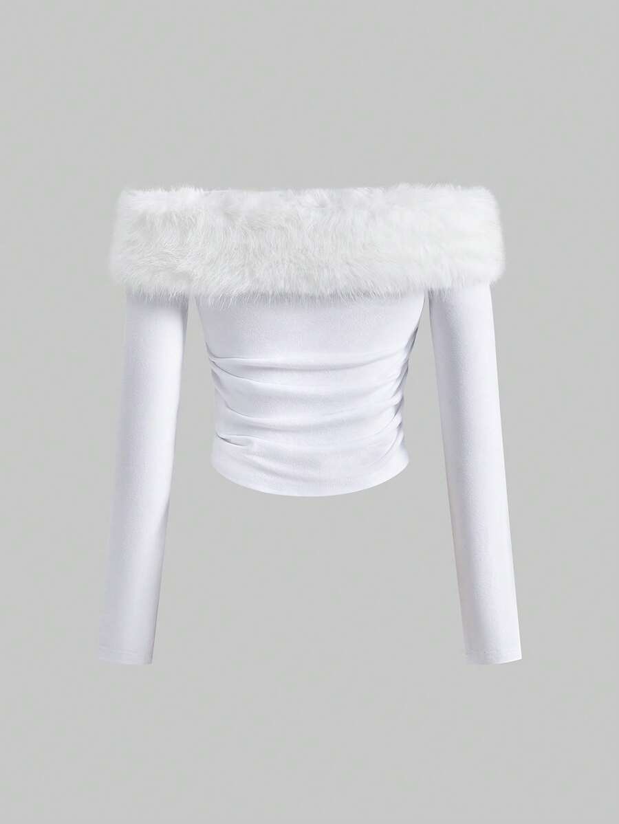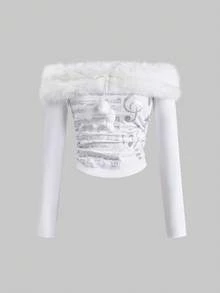 J-Fashion Gyaru Y2K Abihimekaji Removable Off-Shoulder Long Sleeve Tie-Up Fuzzy Decor Top, Suitable For Winter Outfits