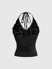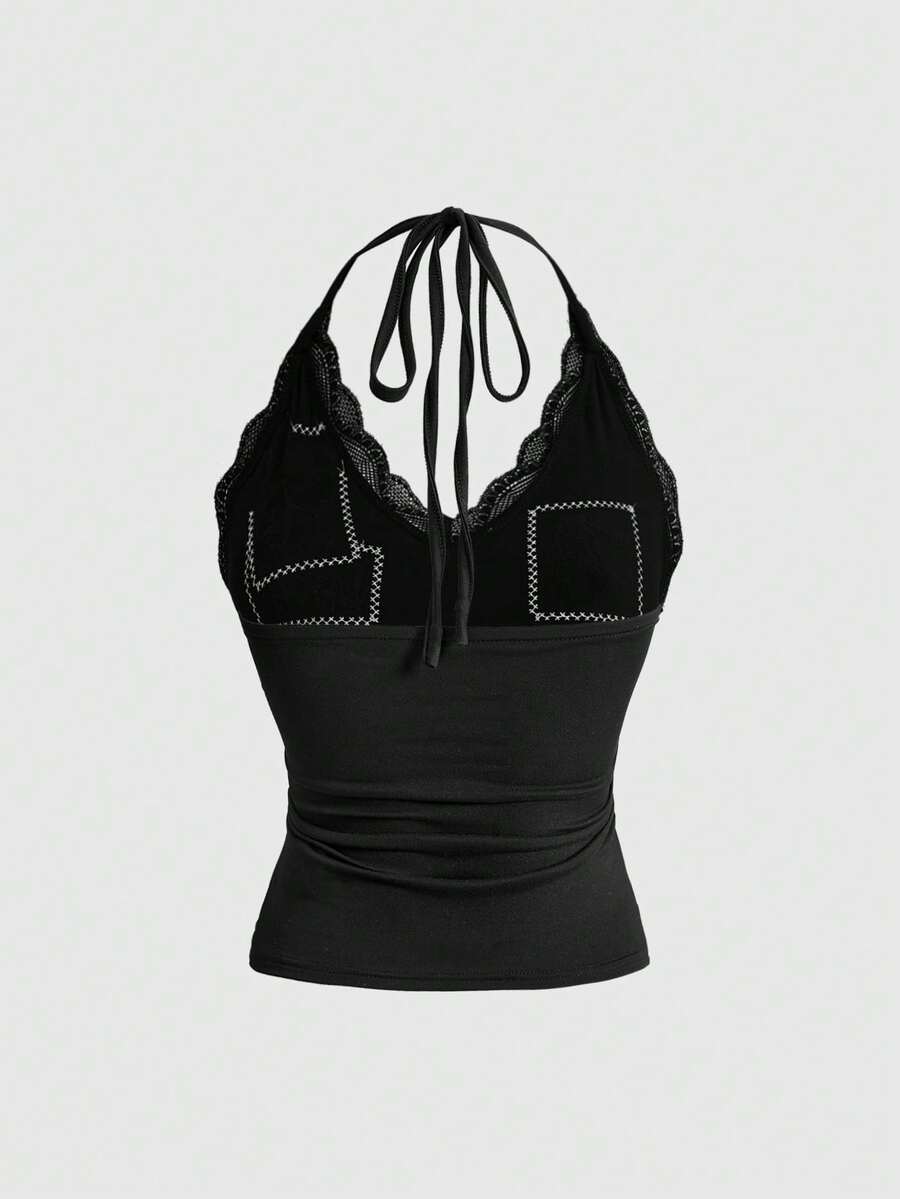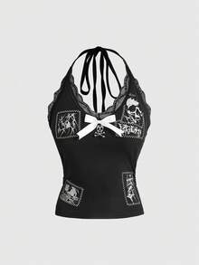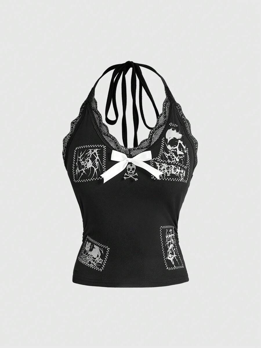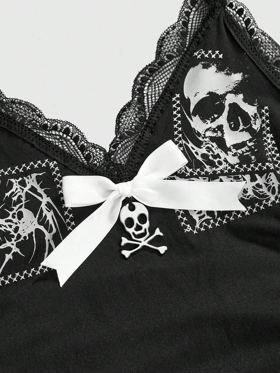 Grunge Punk Gothic Style Lace Patchwork Camisole Top With Skull, Spider, Eye Embroidery And Stitching Details For Women