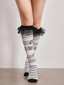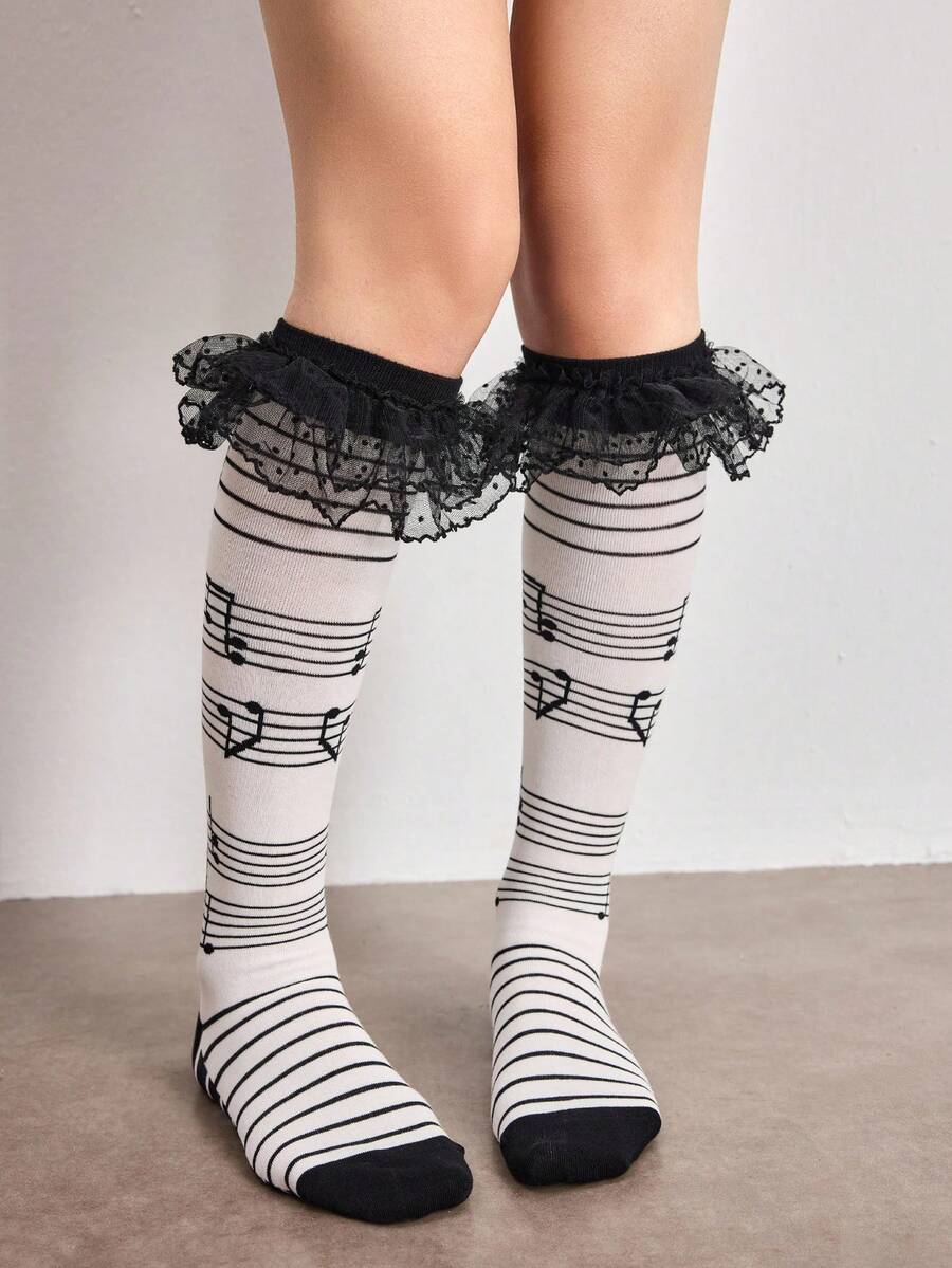 Anime 1 Pair Y2K Millennium Retro Music Note & Pentagram Print Contrast Lace Trim Mid-Calf Socks, Minimalist Lolita Style Socks For Women, Suitable For Daily Wear, School, Dates, Shopping