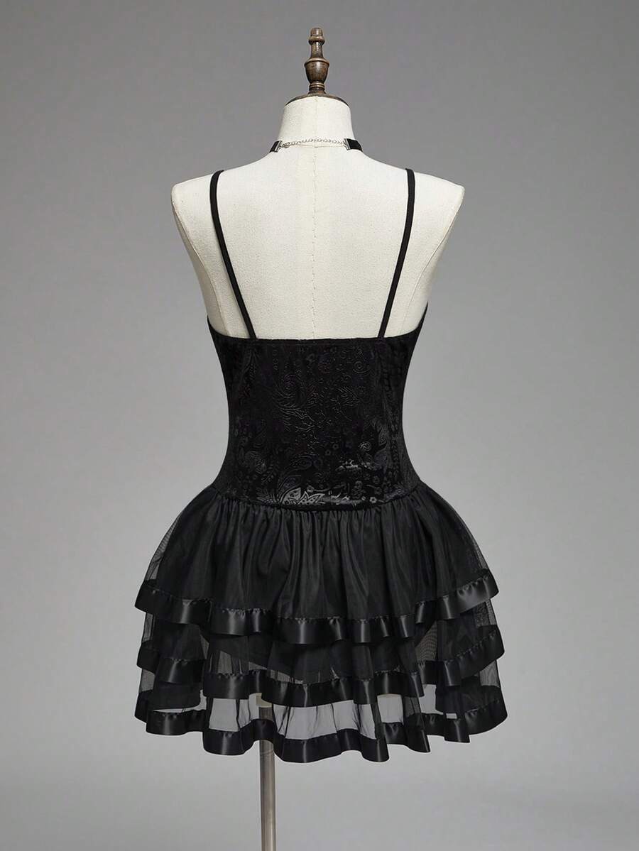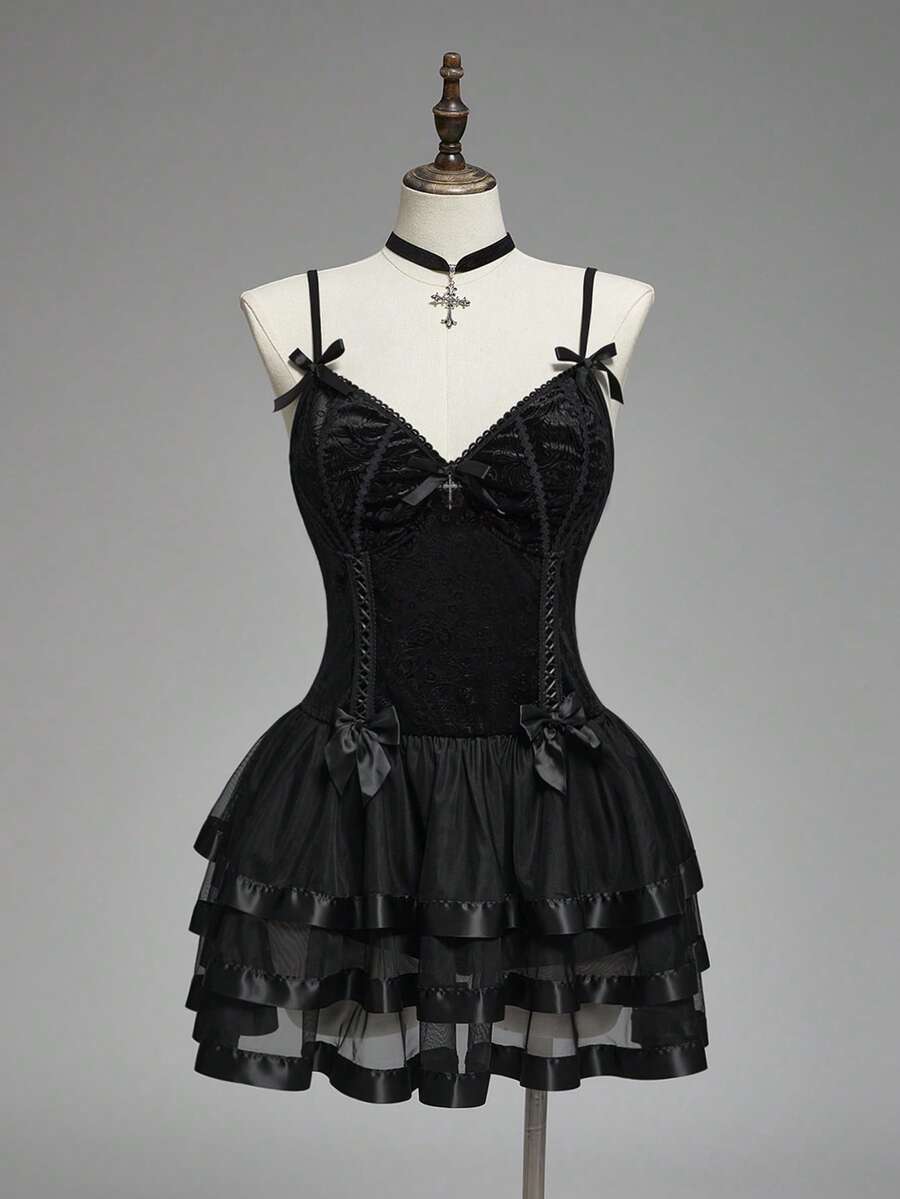 Gothic Palace Style Luxurious Princess Cake Skirt Bow Strap Black Dress, Plus Size Dress, Sweet & Cool Dark Goth Elegant Gothic Dress